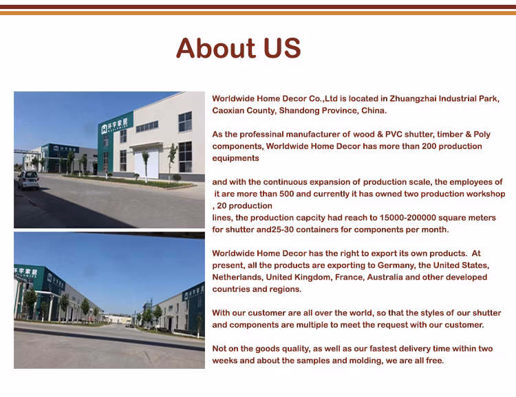Мы производим в основном Паулоуния, Бассвуд, ПВХ, алюминиевые плантационные ставни и Паулоуния, Компоненты затвора из ПВХ и тополь. На заводе сейчас имеется 4 производственных цехов, каждый из которых имеет ежемесячную производственную мощность около 15, 000-20, 000 квадратных метров.